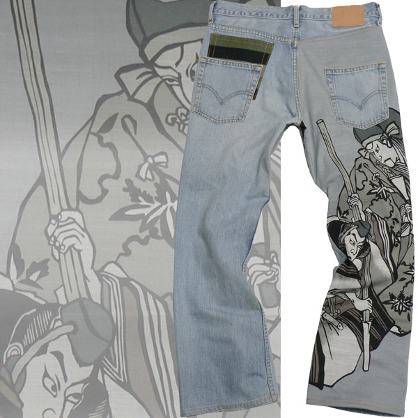 代引送料無料★古着リメイクジーンズ歌舞伎調和柄W34渋グレー黒